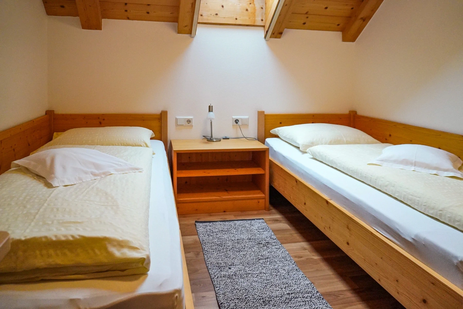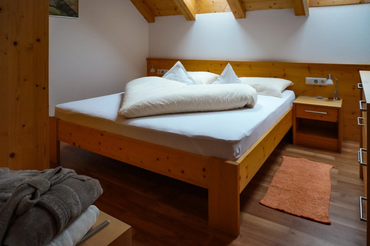 Unsere Zimmer sind mit naturbelassenem Fichtenholz kombiniert mit Buchenholz möbliert.